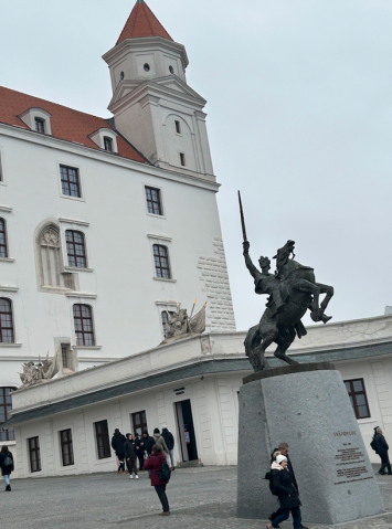 Nous parcourons à présent la vieille ville où les rues ne sont que piétonnes en cette saison qui plus est le 6 Décembre, jour de la St Nicolas ! Sous la direction de notre guide locale nous arpentons la rue Michalska l’une des plus anciennes de la capitale où la majorité des demeurent est de style Renaissance. Nous franchissons l’impressionnante porte Michel, l’une des 4 ouvertures qui perçaient autrefois les murailles protectrices enserrant la ville à sa création. La place du Palais Primatial est bondée et il faut redoubler d’attention pour éviter les pickpocket dont Bratislava s’est fait, hélas, une amère spécialité …