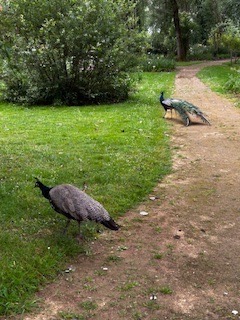Après une nuit passée sur le parking , à 10h nous avons visité la Roseraie, avec la présentation des 4 hectares, du jardin à l’anglaise avec 13 000 rosiers, pendant cette visite nous avons été accueilli par des paons qui n’ont pas voulu nous faire la roue de la fortune. Au milieu des 4 hectares un jardin de l’horoscope végétal qui a permis de savoir avec notre date de naissance quel arbre nous correspondait (nous avons souri quand Richard a découvert qu’il était pommier comme son nom de famille).