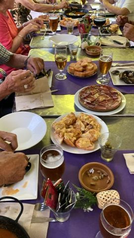 Démarrage en binôme plus tôt que prévu pour le camping de Mataro où Ernest et Josiane les attendaient pour l’installation. Un beau camping, sans mobil home avec vue sur mer et belle piscine a ravi tout le monde. Marcel le chef des boules a constitué 2 équipes de 4 pour une pétanque acharnée, pendant que d’autres goutaient à l’eau de la piscine. A 19 heures rendez-vous pour le traditionnel apéro de bienvenue et les consignes. C’est au restaurant que l’initiation aux tapas et à la boisson nationale s’est faite. Puis chacun, est reparti dans son nid pour une bonne nuit réparatrice.