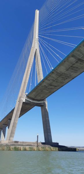 L’après-midi, départ pour une traversée de l’estuaire de la SEINE avec le bateau « VILLE DE HONFLEUR », qui nous permet de découvrir le PONT DE NORMANDIE avec vue du dessous. Inauguré en 1995, il était à cette époque le plus grand d’Europe avec ses 2141 mètres de long, ses pylônes de 214 mètres de hauteur et ses 23 mètres de largeur avec 7 ans de travaux. Cette sortie dans l’estuaire de la SEINE nous a permis de mieux connaître le trafic international de bateaux porte-containers et pétroliers, avec une hiérachie de ceux-ci par leurs volumes, les monstres de la mer restent au HAVRE, les moyens vont à HONFLEUR ou ROUEN et les plus petits PARIS.