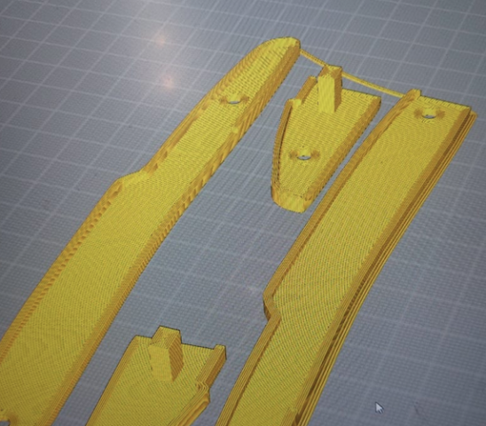 Un exemple récent : la fabrication de pièces d’aspect pour le camping-car de notre ami Kleber, destinées à fermer les profils en aluminium de la porte. Les pièces modélisées apparaissent ici en jaune.